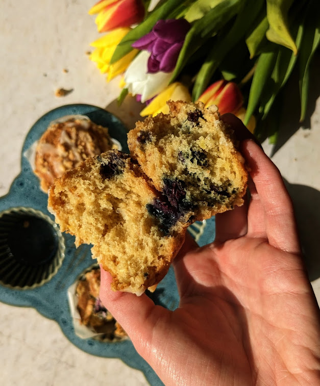- Dusting the blueberries – Make sure to not skip out this step. Dusting the blueberries in flour prevents them from sinking to the bottom of the muffin, and leaving you with a plain muffin and a soggy blueberry bottom. Trust me, I have made this mistake before.