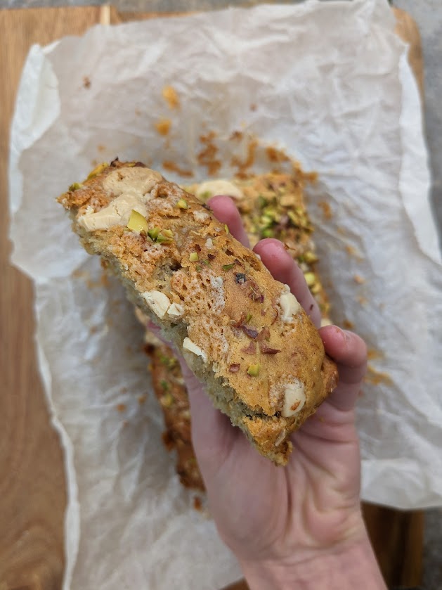 - You can sprinkle some extra vegan white choc chunks and pistachios on the top for a nice finish if you like.