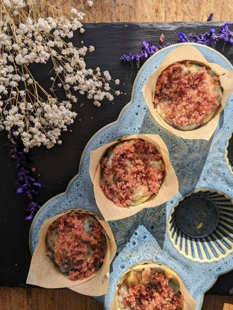 - Add a little blueberry jam to the demerara sugar and add to the tops of the muffins.