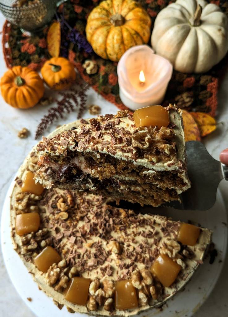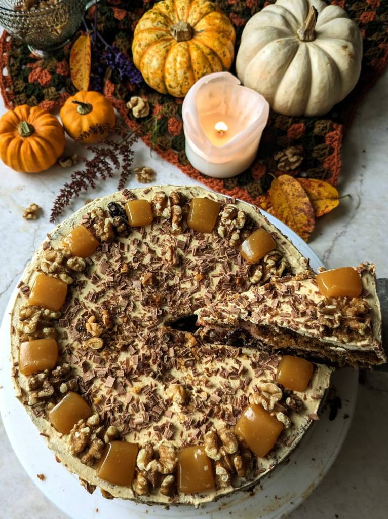 This beautiful autumn cake is the perfect way to start off November. It consists of moist coffee sponges, layered between rich coffee frosting, spiced fig jam, toasted walnuts and topped with chewy caramel drops and chocolate shavings. If you love autumn flavours, this cake is definitely for you!