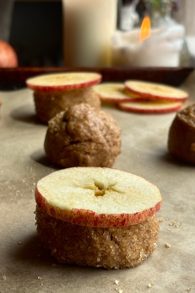 • Top each with a thin apple slice, I cut mine with the apple on its side to get a star shape in the middle.